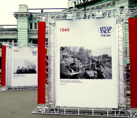 НСНБР. Москва готовится встречать День Победы. Год 2014. Площадь Белорусского вокзала. Выставка фронтовых корреспондентов ТАСС. Автор фото председатель НСНБР А.Г.Огнивцев.